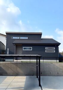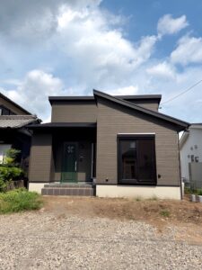 名張市の2LDKの平屋くんです。黒い外壁に窓枠が白なので映えますね。