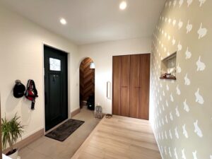 わんちゃん用に玄関ホールで4.5帖有りめちゃ広いです。壁紙はうさぎですね。