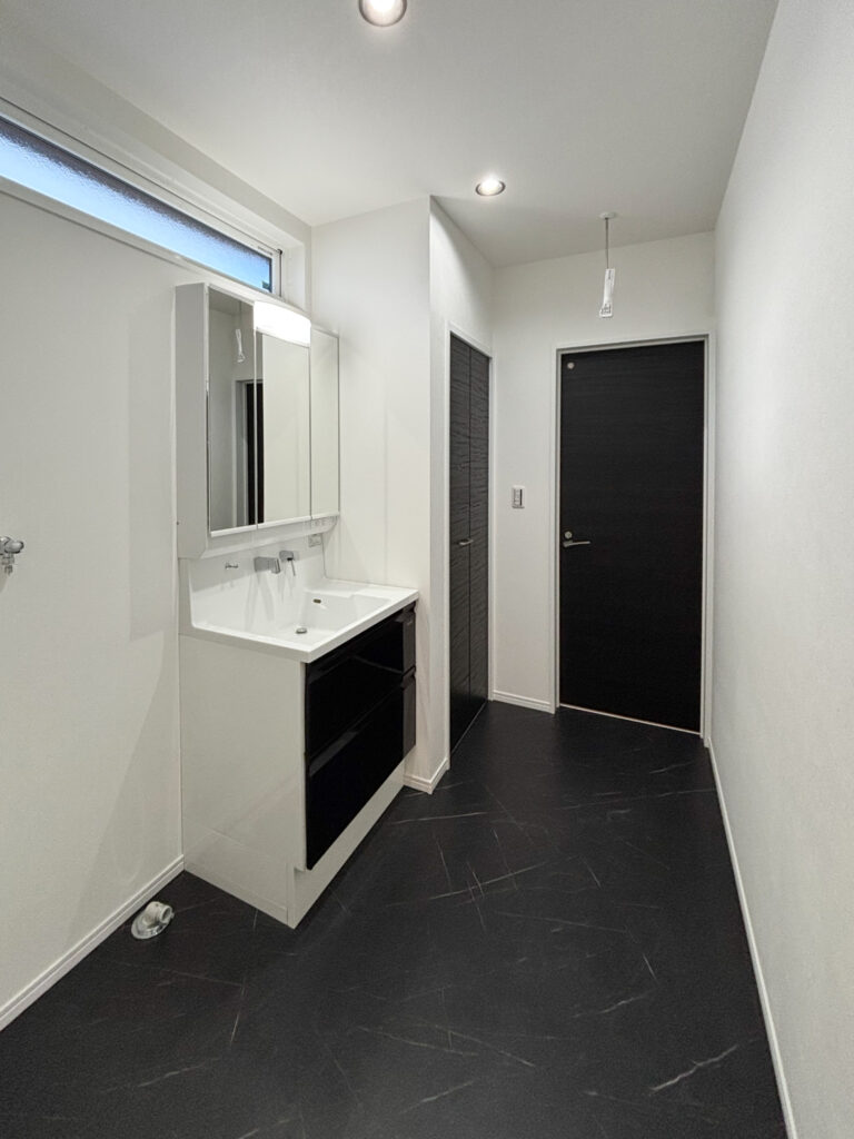 タカラスタンダードのホーロー洗面化粧台のある平屋です。約3帖分の広さに、天井には脱着式の室内物干しを設置しているので、ランドリールームとしても使用できます。