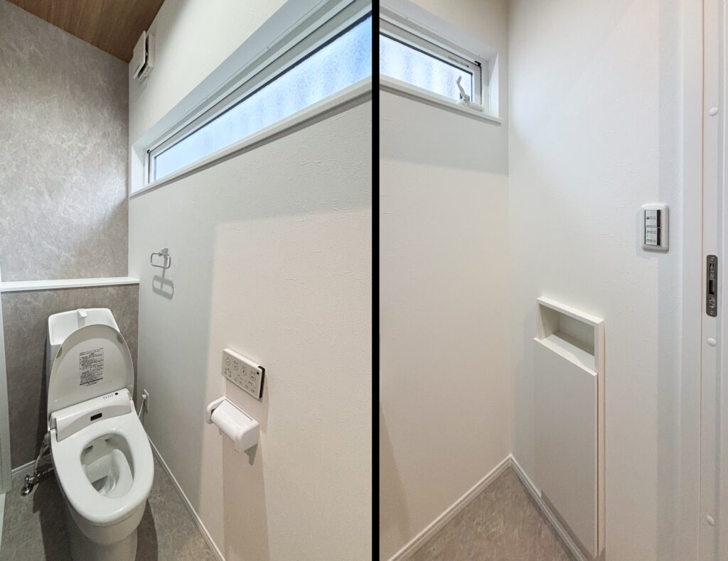 トイレに壁面収納がある平屋です。淡いグレーのクロスがオシャレですね♪