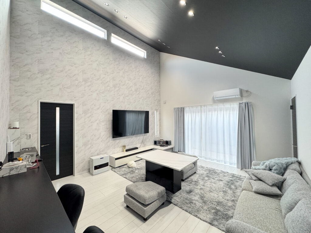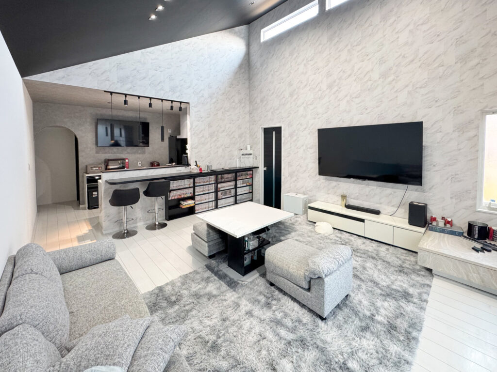 床の白色で空間を明るく保ち、天井の黒色クロスで空間を引き締め、白の大理石調のアクセントクロスが高級感を醸し出しています。キッチン前にカウンターを設置することで、自宅にいるのにオシャレなバーにいるかのような気持ちになる平屋です。