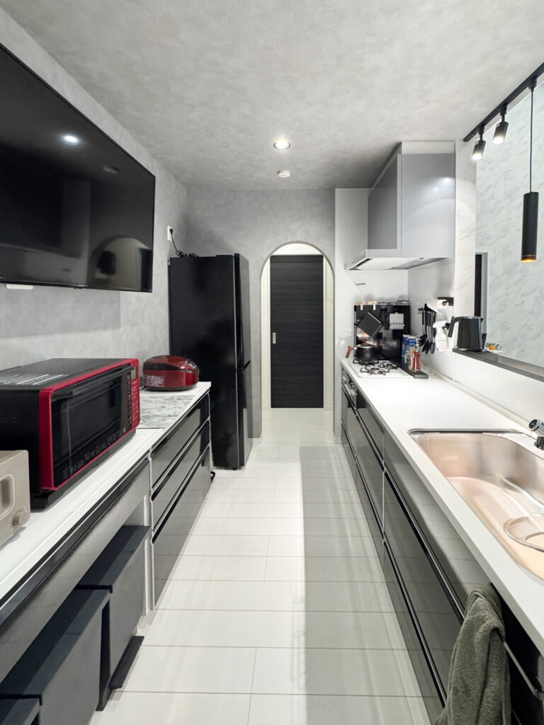 タカラスタンダードのホーローシステムキッチンのある平屋です。コンロの天板は白色、キャビネットの扉カラーは黒色とリビングのモノトーンの雰囲気に合わせた組合せとなっています。奥のアーチ垂れ壁はパントリーとなっていて、お買い物から帰って来た時はリビングを経由しなくても廊下の扉から直接パントリーへ収納することができます。
