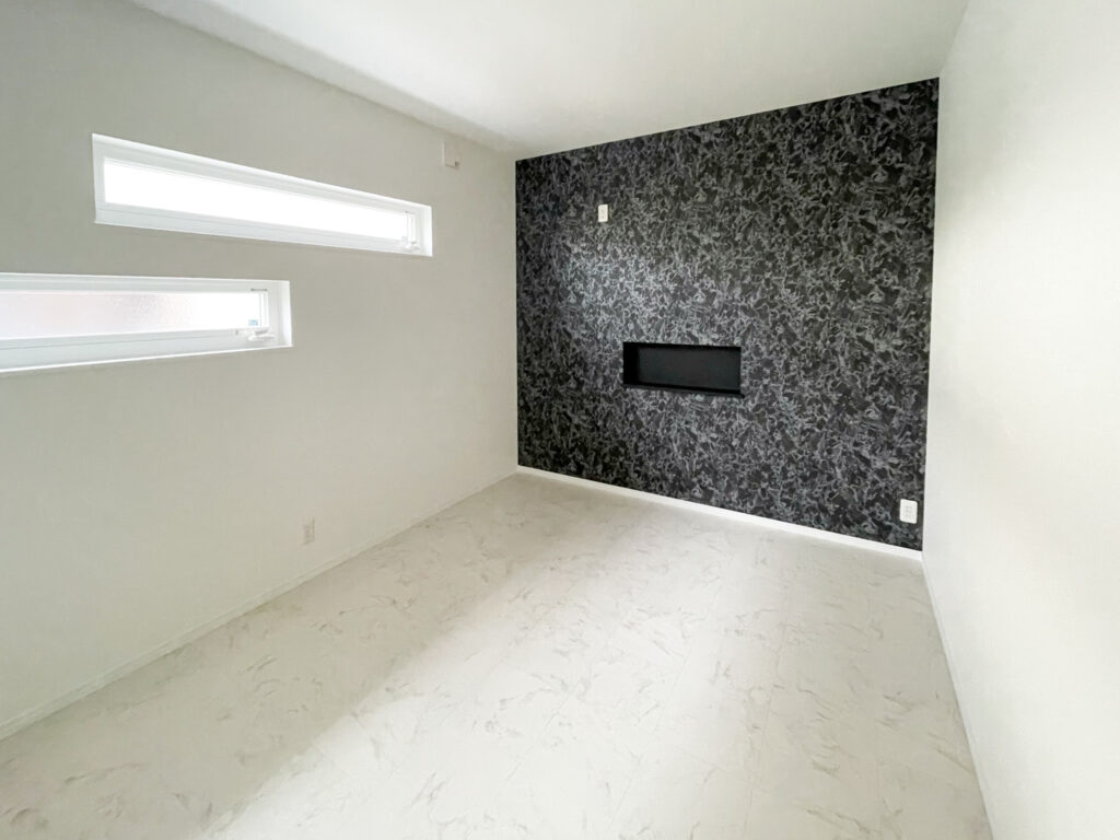 6帖の寝室のある平屋です。段違いの横長窓やアクセントクロスがオシャレなお部屋となっています。アクセントクロスの中央にある黒い横長のニッチが、デザインのアクセントとして効いています。スマホや小物を置くのはもちろん、間接照明などを仕込んでも映えそうですね。