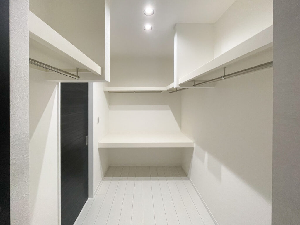 3帖のウォークインクローゼットがある平屋です。寝室だけでなく、ランドリールームに続く廊下からの2方向から出入りできる便利な動線となっています。