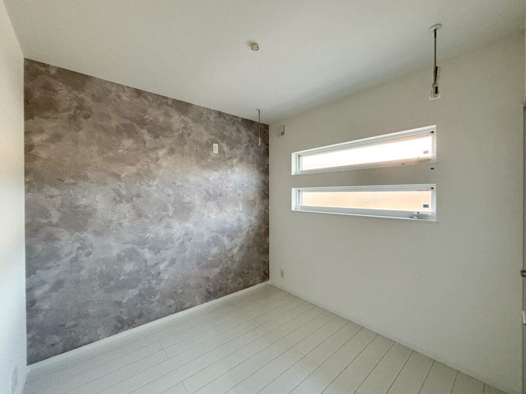 4.5帖の洋室のある平屋です。室内には1帖分のウォークインクローゼットがあります。グレーのアクセントクロスがコンクリート調や塗り壁のようなニュアンスがあり、モダンながらも少し柔らかく、落ち着いて過ごせそうなお部屋となっています。