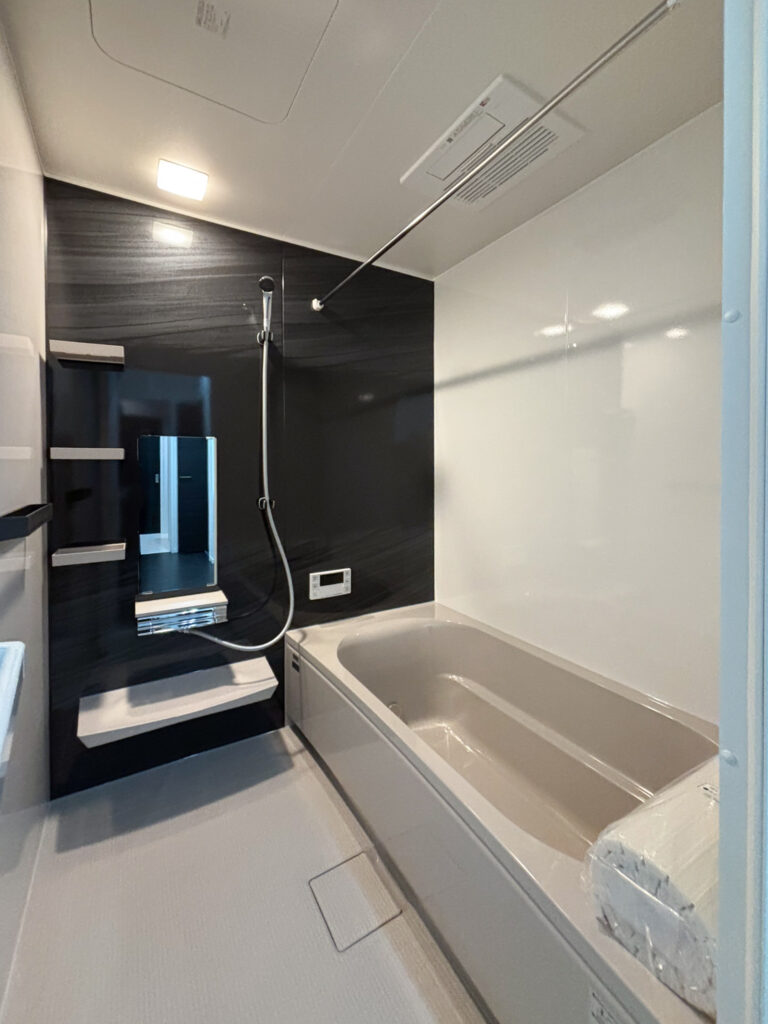 タカラスタンダードの耐震システムバスのある平屋です。お家全体の雰囲気に合わせた黒のアクセントパネルが格好いいお風呂です。